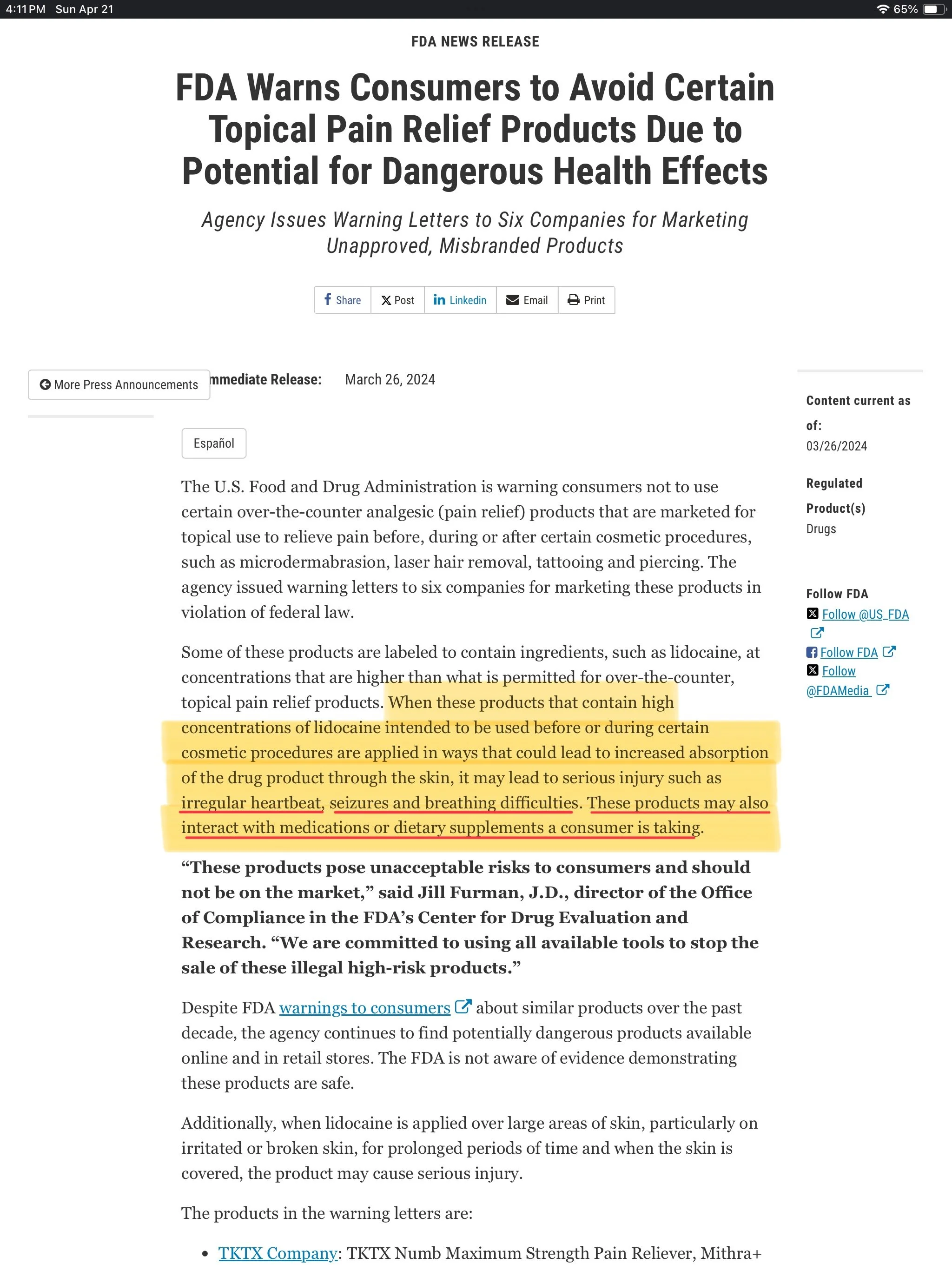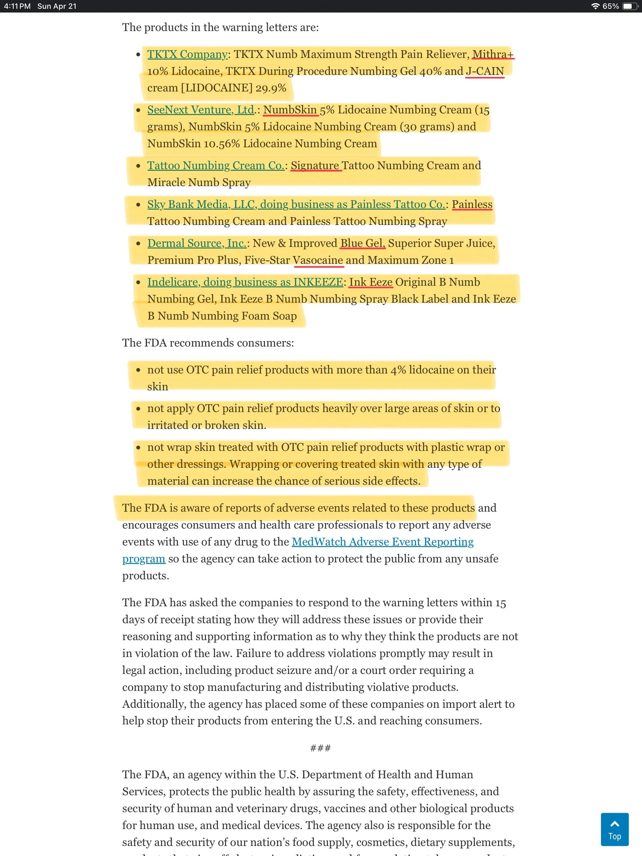 The main active ingredient in numbing creams is Lidocaine. The FDA recently released a warning for consumers to avoid certain numbing creams due to their potential for health hazards. Creams with a higher than 4% concentration of lidocaine or that are intended to be applied in a way that could increase absorption through the skin may cause serious health side effects including… irregular heartbeat, seizures, breathing difficulties, numbness or prickling around the mouth or tongue, ringing in ears, blurred vision, dizziness, changes in mood or awareness. These products may also interact with medications, otc pain relievers or supplements.