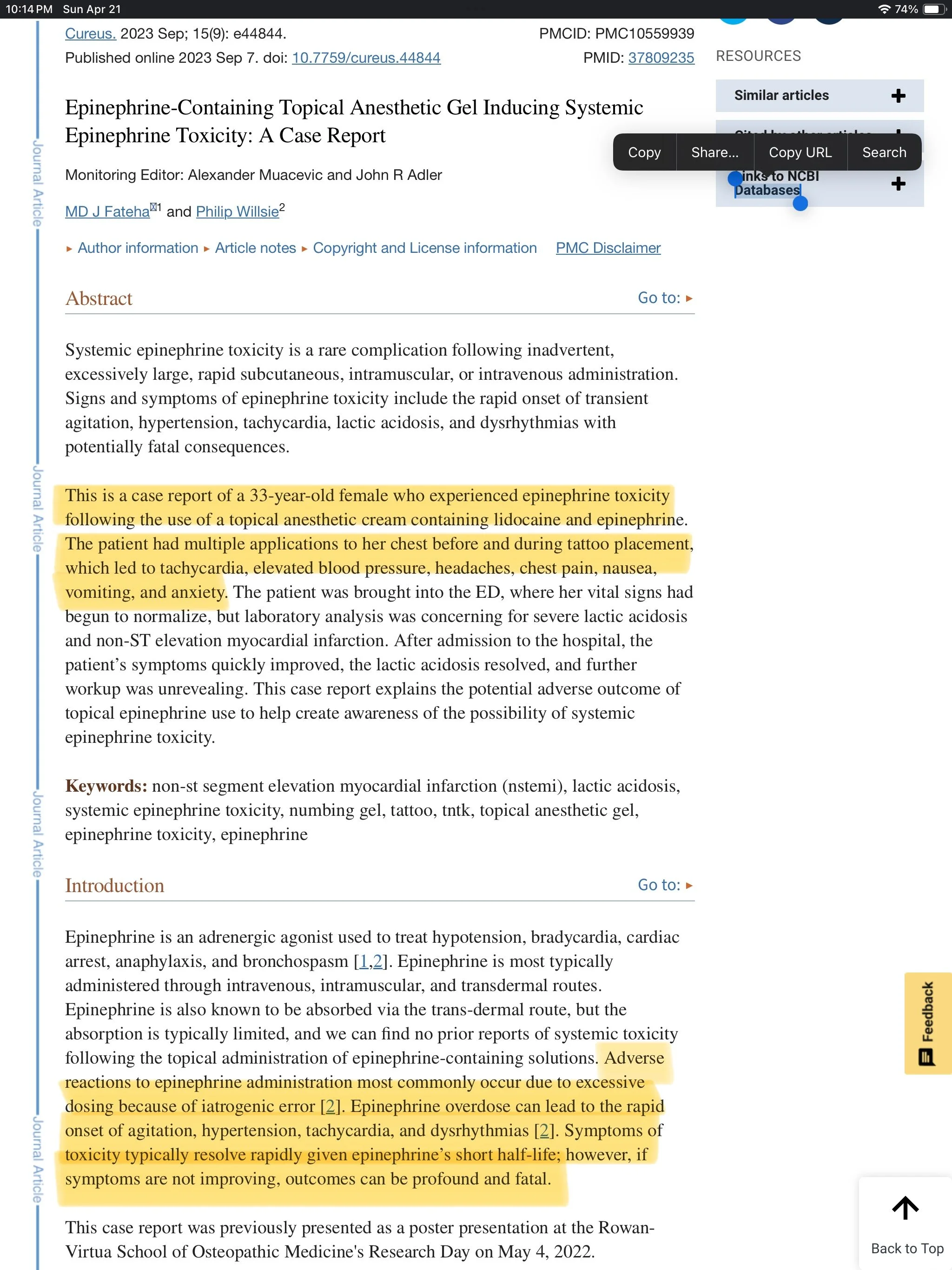 A common ingredient used in numbing creams is epinephrine. It’s a vasoconstrictor used to keep the lidocaine localized and prevent it from wearing off quickly. This also causes the skin it’s applied to become noticeably tougher to work with and can hinder pigment saturation. There have also been cases of epinephrine toxicity due to over absorption because of over usage or use on broken skin. Epinephrine overdosage can cause serious heart conditions such as tachycardia, elevated blood pressure, hypertension or dysrhythmia.