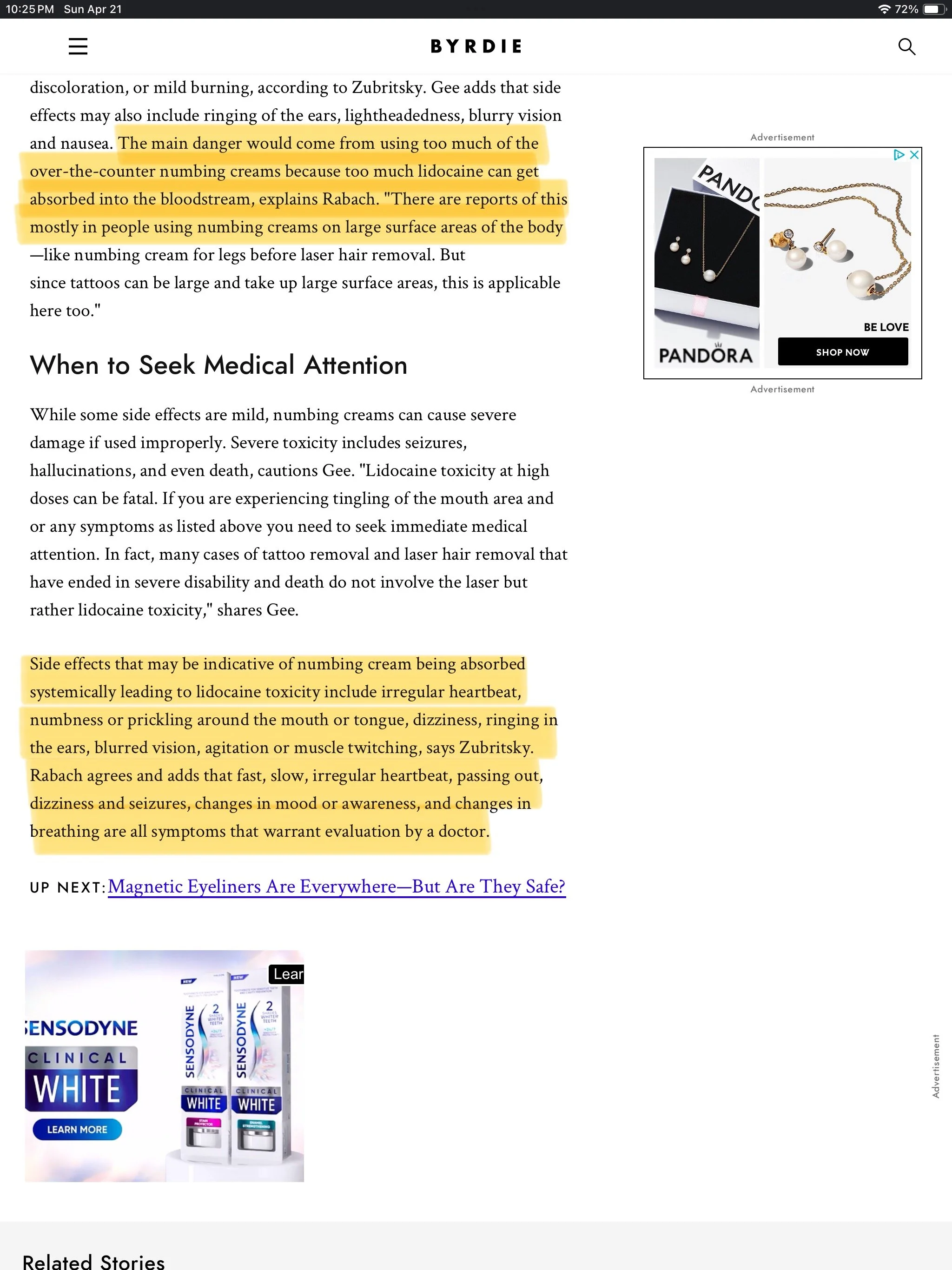 I personally will not use or recommend any numbing creams to prevent liability issues from arising. Also knowing these possible side effects, I cant do so in good conscience. If you choose to use them for yourself that’s your choice. However the onus is on you, if health or healing difficulties do arise, as you have chosen to use a product on your own. Free touch-ups also will not be guaranteed.